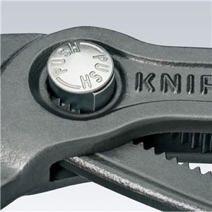 - アゴの開き調整はプッシュボタンで簡単 ●KNIPEXの“コブラ”は高性能なウォーターポンププライヤーです。 ●ジョイント部は横方向へのブレを防止する3枚合わせ(ボックスジョイント)。 ●プッシュボタン