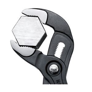 アゴの開き調整はプッシュボタンで簡単 ●KNIPEXの“コブラ”は高性能なウォーターポンププライヤーです。 ●ジョイント部は横方向へのブレを防止する3枚合わせ(ボックスジョイント)。 ●プッシュボタンにより、素早く簡単にアゴの幅を細かく調整できます。 ●アゴの開き調整はプッシュボタンにて行うため、作業中は不意に口幅が変わらないので安心です。 ●アゴの開きは片手で調節が可能です。 ●アゴの開き幅の調整に時間を必要としません。上のアゴを対象物にあて、プッシュボタンを押しながら、下アゴを上にスライドさせるだけで簡単に調整することができます。 ●口幅を最大に調節して握っても、ハンドルの間にクリアランスを確保する指詰めストッパー付き。 ●少ない力でパイプやナットを確実につかむ平行四辺形のアゴ形状。 ●てこの原理を最大限発揮するデザインで高いグリップ力を発揮します。 ●入念な焼入れ処理が施されたつかみ面の硬度は約HRC61で、耐磨耗性が高く、確実なグリップを発揮します。 ●材質はオイル焼き入れ焼き戻し処理済みのクロームバナジウム電気鋼。 【仕様】 ●ヘッド仕上げ:グレー防錆コート、磨き ●ハンドル仕様:プラスチックコーティング(滑り防止仕上げ) ●パイプつかみ能力(φmm):32 ●ナットつかみ能力(mm):30 ●質量(g):145