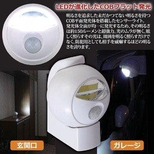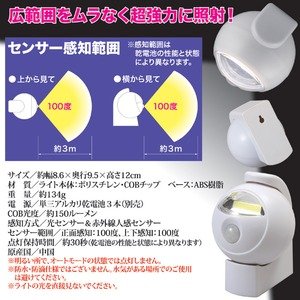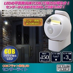 - 【出荷目安】:3 - 8営業日 ※土日・祝除く 【同梱区分】:TS 1102 【梱包サイズ】:通常商品 ●LEDの平面発光体「COB」のセンサー感知ライトが登場! ●動きを感知して自動で点灯!自由に角度も調節できる! ●光センサー内蔵で、暗くなってから作動するオートモード付き! ●約150ルーメンの大光量で足元までハッキリ照らす! 夜間の帰宅時に、玄関が暗いのは防犯的にもあまり良くありません。そこでセンサー感知して点灯してくれるLEDライトが大変便利です。置いたり壁に付けても使えますが、乾電池式なのでポンっと気軽に設置できるのがイイところです。角度も自由に変えることができ、感知後、約30秒間点灯します。明るさは、センサーライトとしては初めてのLEDの平面発光体「COB」を搭載。未だかつてない明るさを体感できます。発光体全面が均一に発光するため、その明るさは約150ルーメンと超強力。光のムラが無く、眩しく照らすその光は、周囲を明るく照らすだけでなく、防犯用としても相手を威嚇するほどの明るさを誇ります。 【商品名】 COBフラッ …★以降詳細は【商品の説明】文面をご参照下さいませ★