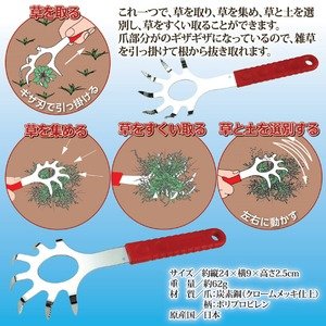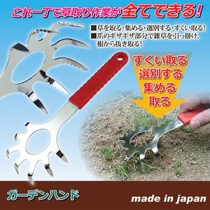 - 【出荷目安】:3 - 8営業日 ※土日・祝除く 【同梱区分】:TS 1102 【梱包サイズ】:通常商品 ●これ一丁で草取り作業が全てできる! ●草を取る・集める・選別する・すくい取る! ●爪のギザギザ部分で雑草を引っ掛け、根から抜き取る! これ一つで、草を取り、草を集め、草と土を選別し、草をすくい取ることができます。爪部分がのギザギザになっているので、雑草を引っ掛けて根から抜き取れます。 【商品名】ガーデンハンド 【サイズ】約縦24×横9×高さ2.5cm 【重量】約62g 【材質】爪:炭素鋼(クロームメッキ仕上) 柄:ポリプロピレン 【付属品】 【生産国】日本 【特記事項】 【注意事項】