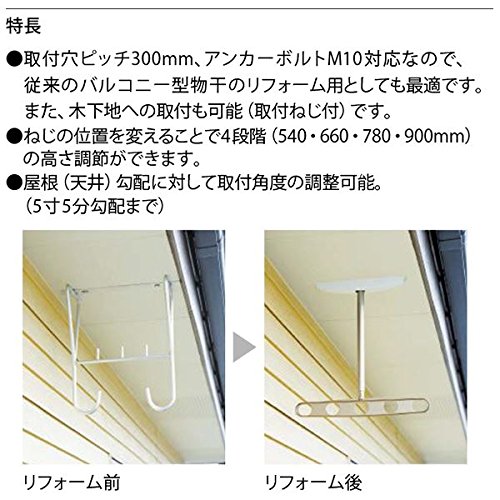 屋根(天井)勾配に対応し、取付角度の調整が可能です。(5寸5分勾配まで)取付穴ピッチ300mm、M10アンカーボルト対応で、リフォーム用としても最適。ねじの位置を変えることで4段階(540・660・780・900mm)の高さ調節ができます。