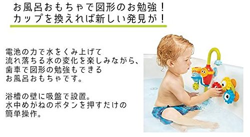 電池の力で水をくみ上げて流れ落ちる水の変化を楽しみながら、歯車で図形の勉強もできるお風呂おもちゃです。浴槽の壁に吸盤で設置。水中めがねのボタンを押すだけの簡単操作。