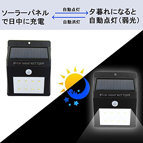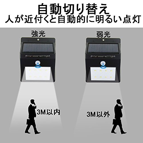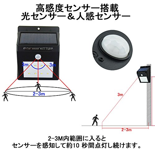 - 感度センサー搭載、2-3M内範囲に入るとセンサーを感知して約10 秒間点灯し続けます。 光センサー+人感センサータイプなので、日没後に人感センサーで自動点灯、人がいなくなると自動消灯になります。