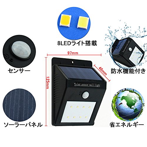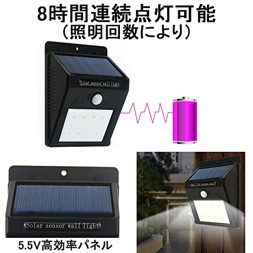 - ソーラー電池内蔵(バッテリー容量800mAh)ですから、完全に配線無し、電池いらず、電気代も一切かかりません、ネジ一本で簡単に設置できます。充電時間、点灯時間は設置場所や天候、季節によって異なります、できるだけ明るい場所への設置が必要です。
