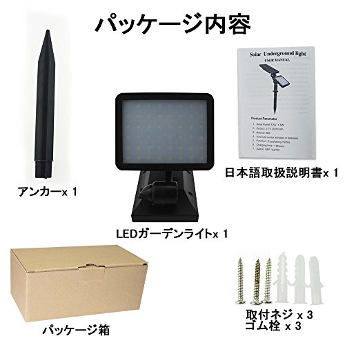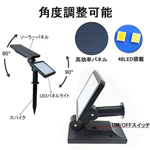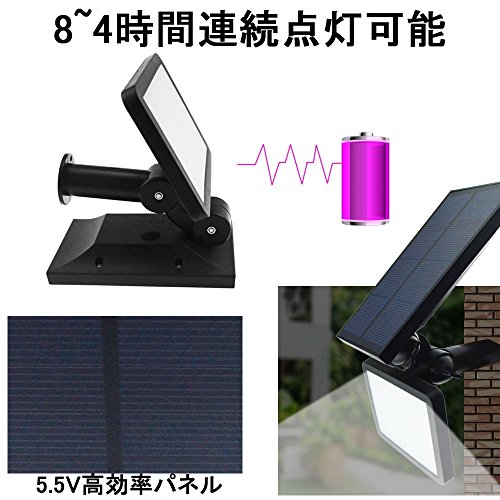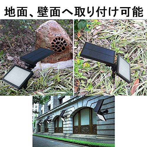 - 地面、壁面へ取り付け可能、防水性も高いという事ですので設置場所に困りません。照射方向とソーラーバッテリーの方向が90度まで調整できて便利です。