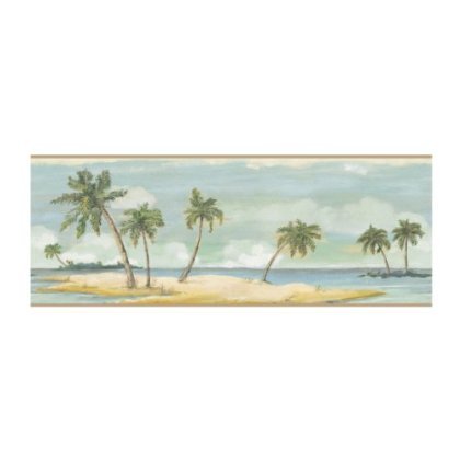 This 9' wide scenic border is a depiction of an exotic tropical island, complete with beautiful palms and the silhouettes of islands in the distance. Artistically crafted to look like an artist's painting done on weathered driftwood. Perfectly suited for any room where an ocean breeze, or the sheer idea of one, can revive the soul.