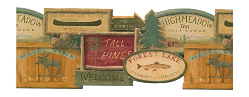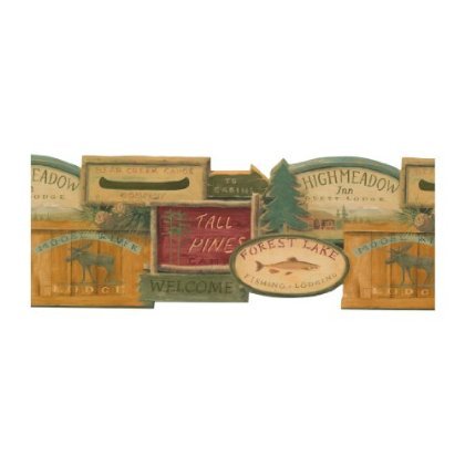 Pretty lodges, majestic moose, canoes, welcome signs and soft pinecones all work together to blend the perfect variety of lodge motifs into a very eye catching wall border. Each frame is pretty in its own rustic way with twigs, planks and worn painted wood adding to the variety that is offered in this motif.