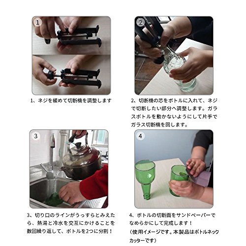 - 【使用方法簡単】ガラスカッターの芯をボトルに入れて、ネジで切断したい部分へ調整します。ガラスボトルを動かないようにして片手でガラス切断機を回します。切り口のラインがうっすらとみえたら、熱湯と冷水を交互にかけることを数回繰り返し、ラインを基点にぱっくりと分割!誰でも手軽で簡単に完成できます!