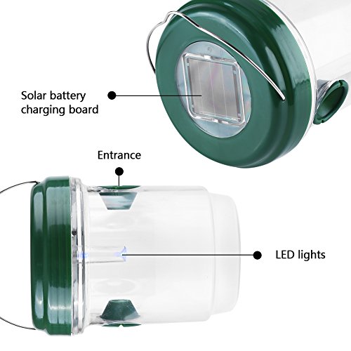 - 【LED誘引&ソーラーパネル】昆虫、蜂などはクッコウセイの特徴があって、LEDの紫外線を利用して昆虫たちを誘引する。ソーラーバネルが付きの設計で、昼間に太陽光を吸収して電力を転換して夜にライトが点灯でき、夜にも使用できる。この誘引捕獲器を使ってあなたの家族にいい環境を作りましょう。