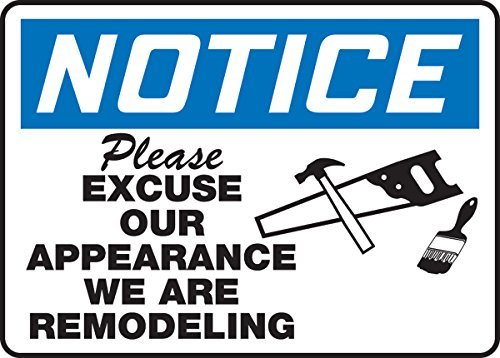 Accuform MCRT808VA Aluminum Sign Legend NOTICE PLEASE EXCUSE OUR APPEARANCE WE ARE REMODELING 10 Length x 14 Width Blue/Black on White
