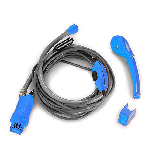 Including a suction cup or Hanging S-hook that holds the shower head, water pressure adjustable knob, electric pump, 2 meter hose, on/off switch, 4 meter 12 volt car plug, and waterproof storage bag. The Portable shower can be connected to water container, to allow you to easily wash your car, pans, dogs, outdoor shoes and have a great shower with sun heated water. Besides, the water power can be adjusted to meet your need.