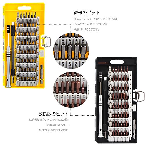 - 【改良のビット】本製品のドライバービットは全てS2鋼を採用して、硬度はHRC58で、従来のCR-Vクロムバナジウム鋼(硬度はHRC52)のビットより、耐久性が大幅にアップしました。