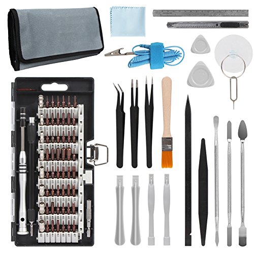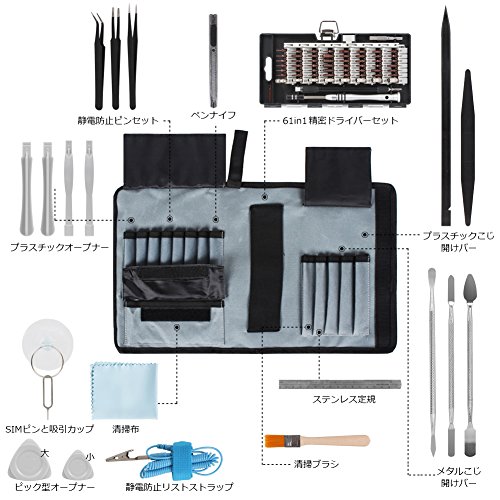 - 【81in1】61in1精密ドライバーセット*1+ペンナイフ*1+ステンレス定規*1+SIMピンと吸引カップ*1+静電防止リストストラップ*1+静電防止ピンセット*3+プラスチックオープナー*4+プラスチックこじ開けバー*2+メタルこじ開けバー*3+ピック型オープナー*2+清掃布*1+清掃ブラシ*1