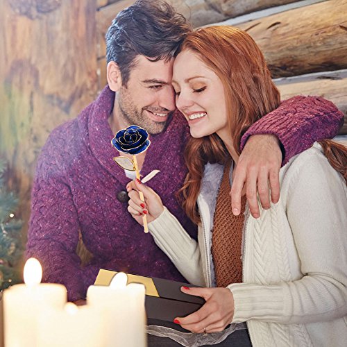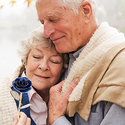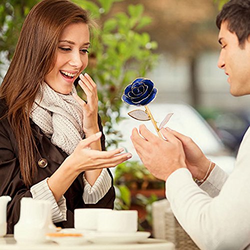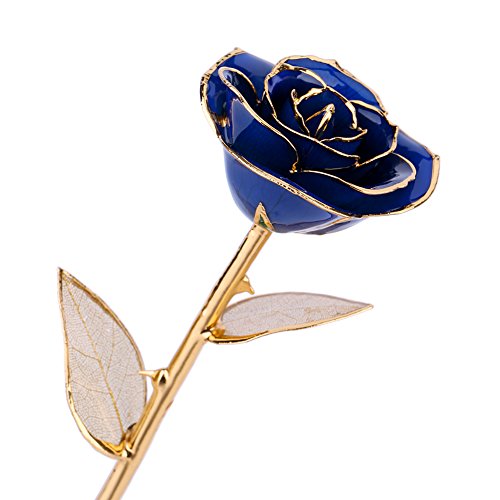 RealローズDipped in 24 Kゴールド、Forever Preserved Long Stem Rose withゴールデンリーフ、Perfect Gift Idea For Her ブルー WXD-JYMG-002