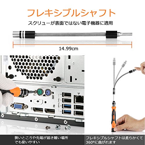 - 多機能修理キット:ドライバーの先端に磁石付け、金属部分にネジ等小さな部品がくっつきますので、細かい作業に便利です。延長シャフトが付き、ツールの長さや異なるタイプのピックを変更できます。フレキシブルシャフトは柔らかくて、306°に曲がれます。狭いところや先端が届き難い場所でも使いやすいです。一つを備えれば、容易で作業性抜群です。
