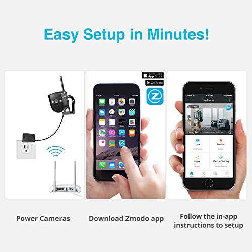 1) Zmodo cameras require the Zmodo app (available for iOS 7 and up and Android 4.0 and up) for setup and a password-protected 2.4GHz WiFi network with WPA/WPA2 encryption. 2) Cameras require power from a standard 100-240V power outlet.Package Includes