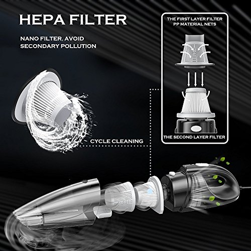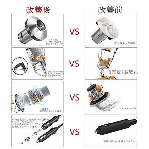 - 【2本のiPhone7 plusを吸い取れるほど吸引力、乾湿両用】:改良後のサイクロン式カークリーナーは4500-4800PAの真空度で、2.5lのコークスを吸い込む程の吸引力があります。乾湿両用で、子供の食べカス、アウトドア後の砂や小石、埃や髪の毛、紙くず、液体まで吸い込めます。実験ビデオ:https://youtu.be/xGGGn0o8t60 / https://youtu.be/n65_9cdAVYU