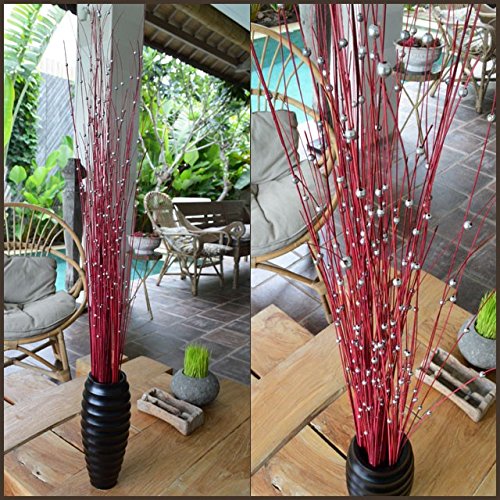 バリ島ならではの素材、パームリーフにアンティークビースを組み合わせて作ったアジアン造花です。 キラキラ輝くアンティークビーズが綺麗でインテリアのアクセントとして存在感抜群のアイテムです。 他のアートプランツやバスケット、モダンなフラワーベース(花瓶)などと組み合わせてディスプレイすると、さらに素敵! アートプランツとは植物のようなオブジェのことです。水をあげる必要もない、お手入れ簡単なアジアンインテリアとして人気急上昇中! アートプランツを飾るのにぴったりな花瓶も取り揃えています。 ■サイズ:1束 約40~100cmの枝がばらばらで125本前後 ■素材:パームリーフ(椰子) ビーズ ■色:レッド■生産国:インドネシア バリ島 【注意事項】 ・配送中、ビーズが外れる場合があります。 ・ビーズはアンティーク仕様の為、シルバー色に黒剥げがある場合があります。 ・フラワーベースや撮影小物等は商品には含まれません。