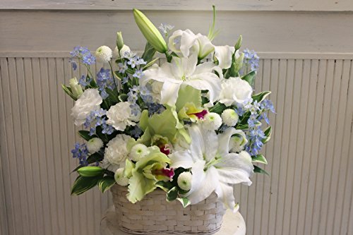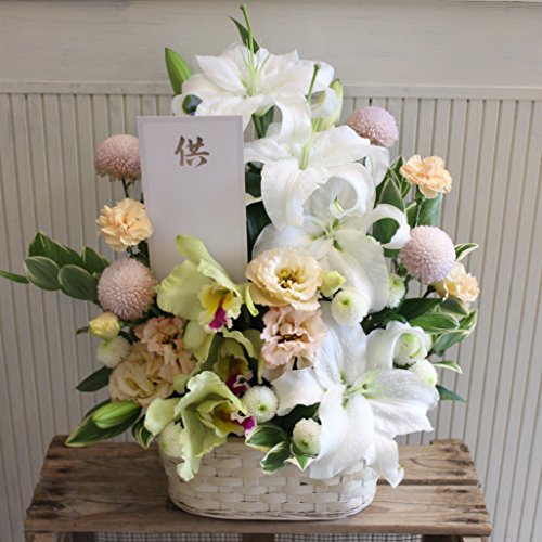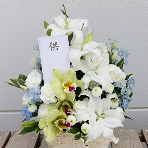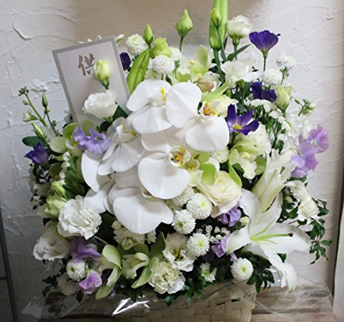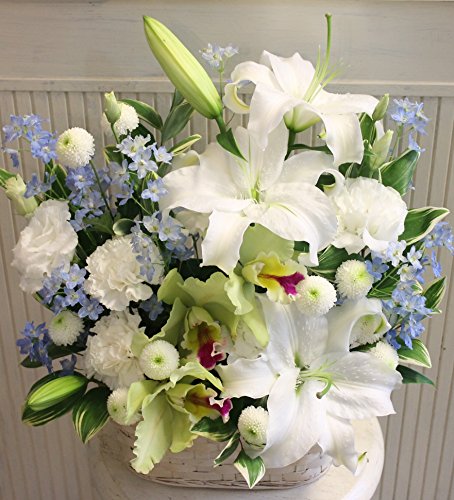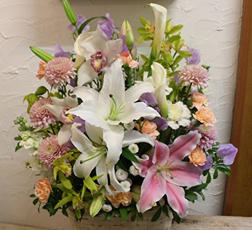 - ◆◆ 白を基調にしたお供え用の生花アレンジメントです ユリとカトレアや胡蝶蘭・シンピジュウムなどの(入荷によってかわります)蘭系のハイグレードなお花と色小花のアレンジです。 ラッピングして箱に入ってのお届けとなります。サイズ 高さ 約55センチ 幅約40センチ奥行25センチ。画像はイメージです お届けするお花の種類・色合いは 入荷状況(季節や気象等の変動)により異なりますのでご了承下さい。