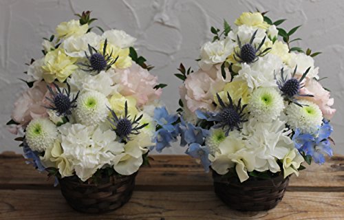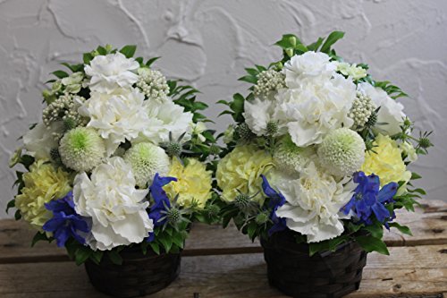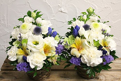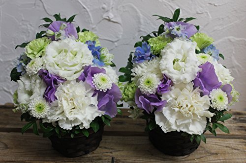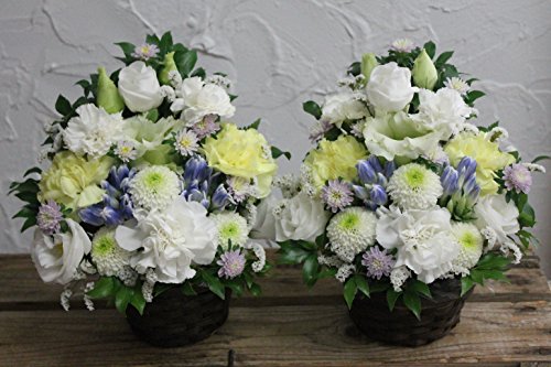- ■■ コンパクトサイズの白を基調にしたお供え用の生花アレンジメントのmini一対です。 手のひらサイズですのでお仏壇に置けます。 ラッピングして箱に入ってのお届けとなります。サイズ高さ 約20センチ 幅約16センチ。 画像はイメージです お届けするお花の種類・色合いは 入荷状況(季節や気象等の変動)により異なりますのでご了承下さい。