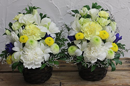 お供え生花アレンジメント(小・一対) お仏壇に置ける mini サイズの2個セットです。初盆 お彼岸 法事 お盆 命日 四十九日 葬儀などに。 ■■ お届け不可日/3月15日(木)16日(金) 22日(木) 29日(木)及び4月5日(木) ◆◆ お届け日時指定便指定可能時間帯はお届け先により異なります。①東北・九州及び山口・愛媛・高知各県へは14時以降の時間帯からお選び下さい。②その他の都府県はすべての時間帯指定可能 (詳細は下欄参照)