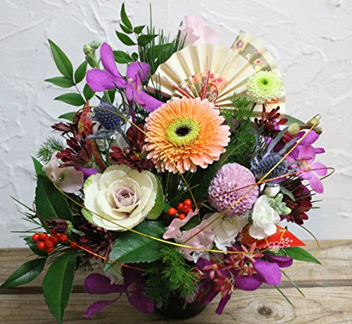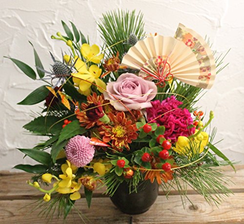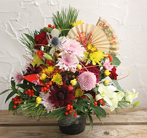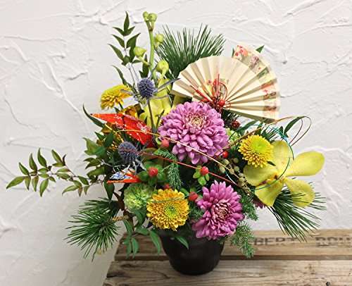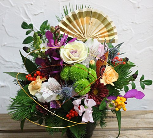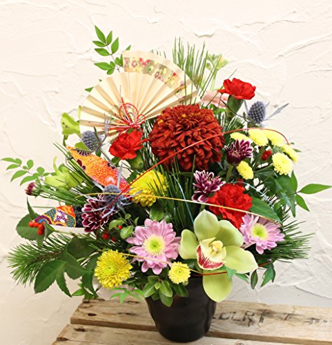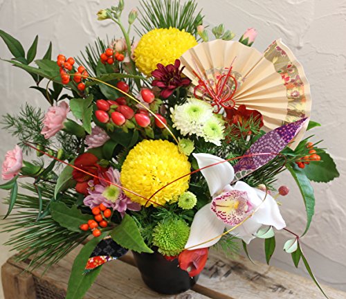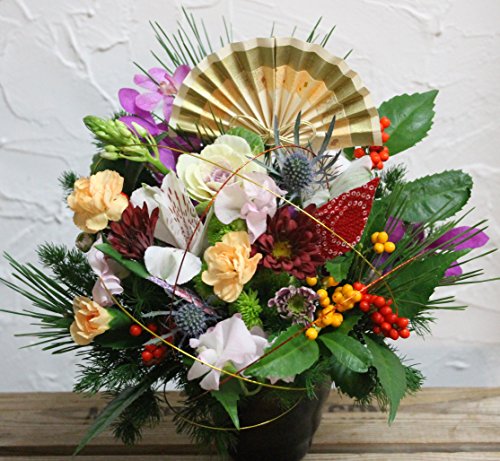 - 黒の陶器の器に松などのお正月花・水引や扇を使い流れるようなフォルムの生花のアレンジメントです。高さ 約28 幅 約25センチ お花は当日入荷の新鮮なものを使用するため見本のお花とは異なることがございます。写真はボリュームとイメージの参考となることをご了承くださいませ。ギフトラッピングしてのお届けとなります。