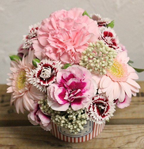 - ◆◆カーネーションやガーベラのカジュアルなお花を手のひらサイズのペーパーカップにぐるっと丸くお花の入ったラウンドスタイルにアレンジしました。 コンパクトですが場所をとらないのでどこにでもおけます 直径13センチ フィルムとリボンでラッピングし 箱に入れてのお届けです。ペーパーカップは青・赤のストライプから当店で選ばせていただいております。画像はイメージです お届けするお花の種類・色合いは 入荷状況(季節や気象等の変動)により異なりますのでご了承下さい。