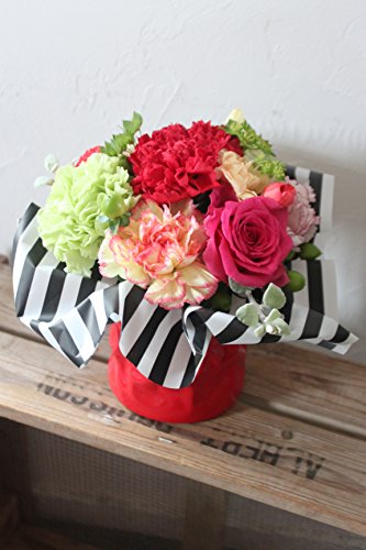 - ふわふわのカーネーションやエレガントな赤・ピンクのバラを真っ赤な陶器の器にぐるっと丸くお花の入ったラウンドスタイルにアレンジしました。 size 直径 約18cm 高さ 約20cm フィルムとリボンでラッピングし 箱に入れてのお届けです。