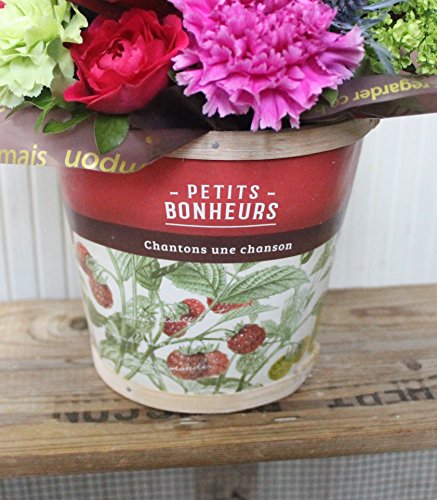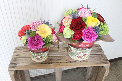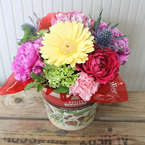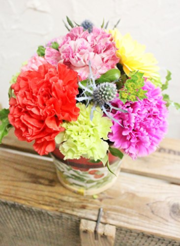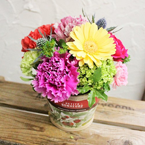 - ▲▲ご注意ください▲▲こちらはatelier miraiのオリジナル商品です。 ご購入はフラワーショップアトリエ未来からお願いいたします。只今amazon内で安価で販売する偽サイトが横行しているようです。ご購入の際は今一度販売店舗をご確認ください。◆◆ カーネーションと元気なイメージのガーベラをおしゃれな小花と一緒にベリーのプリントされた木のバスケットにアレンジしました。ぐるっと360度どこから見てもお花の入ったラウンドスタイルです。 size 直径 約18cm 高さ 約18cm フィルムとリボンでラッピングし 箱に入れてのお届けです。