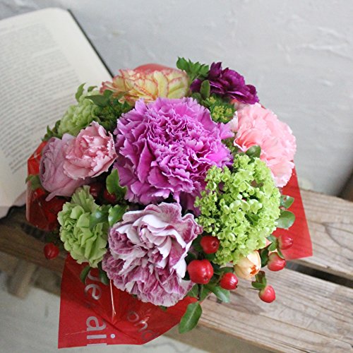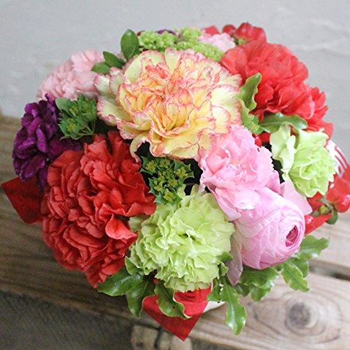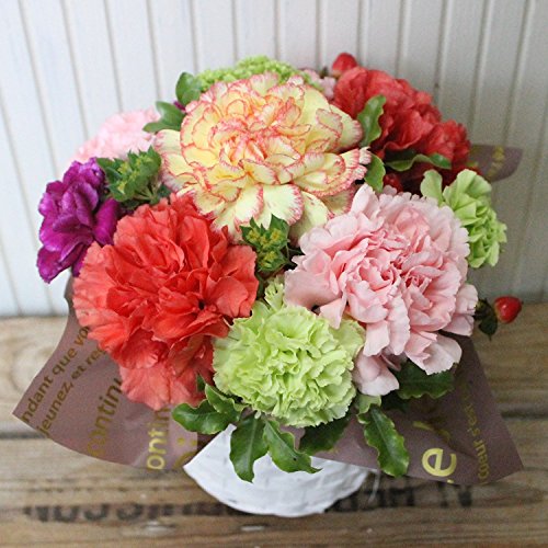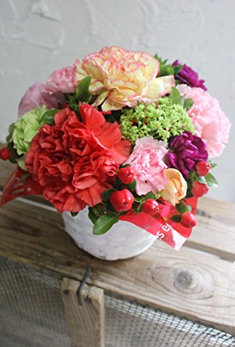 - ◆◆ ミックスカラーのカーネーションと色々な小花をを爽やかな白のバスケットにアレンジしました。ぐるっと360度どこから見てもお花の入ったラウンドスタイルです。 size 直径 約18cm 高さ 約18cm フィルムとリボンでラッピングし 箱に入れてのお届けです。★画像はイメージです お届けするお花の種類・色合いは当日の 入荷状況(季節や気象等の変動)により異なりますのでご了承下さい。Lサイズの豪華なアレンジメントもご用意しておりますので併せてごらんください。