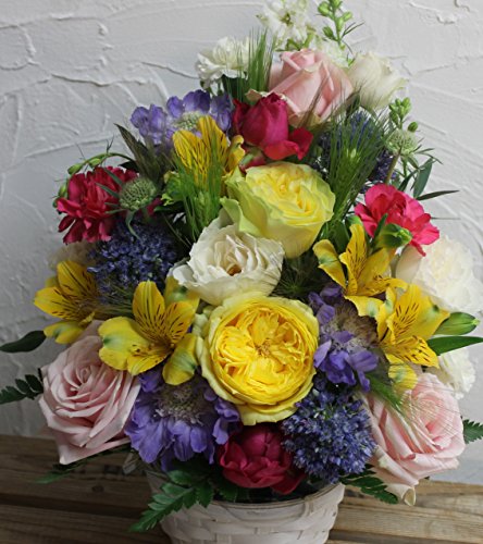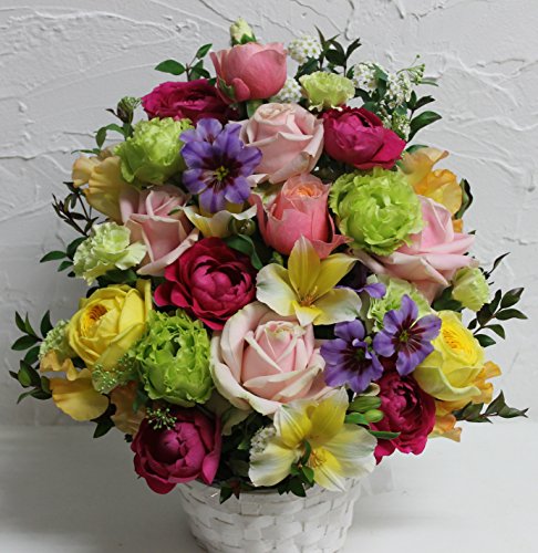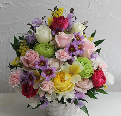 - ◆◆ お祝い事や誕生日 におすすめです。アレンジは季節のお花を使い当店のお任せとさせていただいております。 Size約 サイズ約 高さ 32センチ 幅26センチ奥行 20㎝ 。 画像はイメージです お届けするお花の種類・色合いは 入荷状況(季節や気象等の変動)により異なりますのでご了承下さい。 フィルムとリボンでラッピングし 箱に入れてのお届けです。