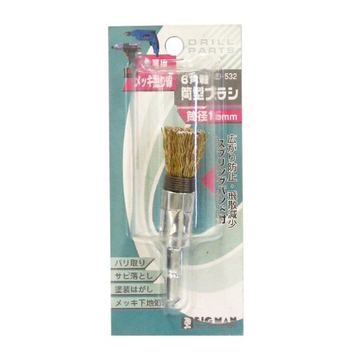 パイプ内面・狭い箇所・コーナー・溝底等のサビ落し、塗装はがし等の研削作業に最適です。 鋼線を真鍮メッキし、撚り加工したブラシです。 研削力が強く、折れ飛びも少なく耐久性があり、安全性が高くなっています。 広がり防止・飛散減少スプリングバンド付。 電気ドリル、充電インパクトドリル又はフレキシブルシャフトに取り付けてお使い下さい。 ブラシ類は《折れ飛び》が発生します。ケガのないよう特に注意して下さい。 筒径:15mm 材質:メッキ撚り線