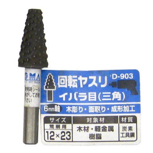 木彫り、面取り、成形加工に。 荒削用 サイズ:12×23 軸径:6mm 対象材:木材・軽金属・樹脂 材質:炭素工具鋼 形状:イバラ目(三角)