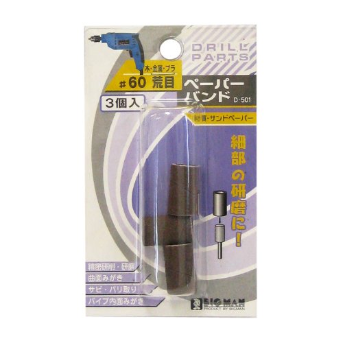 精密研削・研磨、曲面みがきに。 サビ・バリ取り、パイプ内面みがきに。 ペーパーバンドをゴムドラムに挿入してご使用下さい。 ゴムの弾力で加工物へのあたりがソフトでスムーズな研削・研磨ができます。 特に小物や精密な作業に適しています。 電動ドリルでも使用できますが、細部研磨にはフレキシブルシャフトに取り付けてお使い下さい。 材質:サンドペーパー 粒度:#60 荒目 入数:3個