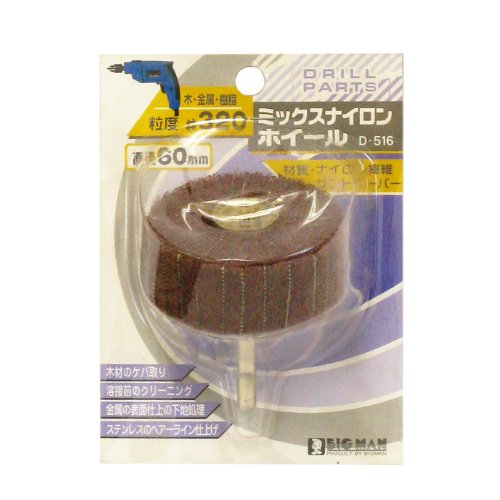 木材のケバ取り、溶接前のクリーニングに。 金属の表面仕上の下地処理、ステンレスのヘアーライン仕上げに。 工業用ナイロン布織布に研磨砥粒を含浸接着させたものにサンドペーパーをはさんだホイールです。 ヤケの発生が少なく、ソフトで均一な研磨ができます。 サンドペーパーをはさんでいないナイロンホイールと比べて研削力がアップしています。 電動ドリル、フレキシブルシャフトに取り付けてお使い下さい。 外径(直径):60mm 粒度:#320 材質:ナイロン繊維+サンドペーパー