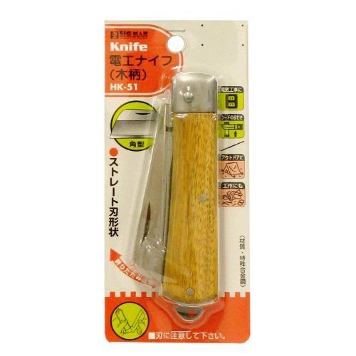 電気工事、コードの皮むきに。 アウトドア、工作に。 形状:角型ストレート刃形状 材質:(刃部)特殊合金鋼、(柄部)木