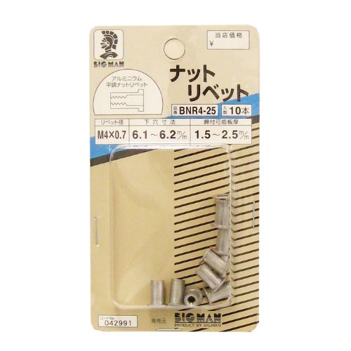 適用ネジ(リベット径):M4×0.7 下穴寸法:6.1~6.2mm 締付可能板厚:1.5~2.5mm 引張強度:410kg 剪断強度:140kg 入数:10本
