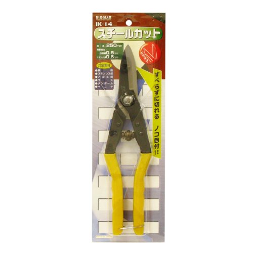 先がとがっているので狭い所にも入りやすく、細かいところも切りやすい。 サイズ 全長250mm 板厚4.5mm 切断能力 軟鋼板0.8mm ステンレス板0.6mm 対象素材:鉄板、ラス、段ボール、ベニヤ、ステンレス板、アルミ板