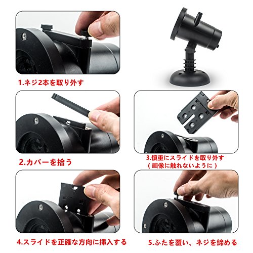 - 【12枚のスライドショー】12枚のスライドショー(絵柄)が付きます。クリスマスツリー、雪片、クローバー、ハイヒール、ハト、誕生日ケーキ、サンタクロース、蝶、スター、紅葉、ピエロ、ハート型です。様々な雰囲気を作られ、映像が自動に動くLED投影ランプです。電源を接続だけ、雰囲気を盛り上げます。