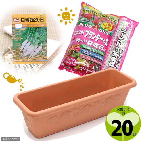 種を蒔いて約20日後に収穫できます!短期間で手軽に収穫できる人気の野菜の種と、オシャレなレリーフプランター、培養土、鉢底石がお買い得なセットになって登場です!鉢底石をプランターの底に敷き詰め、土を入れて種を蒔けば栽培スタート!とっても簡単です。プランターはスタンダードな65cmタイプなので、ベランダやお庭のちょっとしたスペースがあれば気軽に始められます。セットの培養土、鉢底石はプランターにちょうど良い容量なので、残った土の置き場所に困る心配もありません。収穫まで20日!「白雪姫20日大根」栽培セット(種・