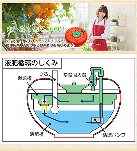 特徴 土を使わず水で育てる家庭菜園セットです。 トマト、キュウリなどの実のなる野菜に最適です。 種をまいて、植物の生育の過程が一から楽しめます。苗からでも栽培が可能です。 植物において一番大切な値を裁量に保つ装置ですので、生育が早く、丈夫に育ちます。 ハイポニカ専用肥料を使いますので、根から養分を完全吸収できます。 循環システムを採用しており、水・肥料の植物への吸収が効率的で収穫量の増加が見込めます。 容器はカワイイトマトの形でガーデニングの素材としても、 エクステリアにもインテリアにもマッチします。 日当たりの良いベランダや室内の窓際で、土を使わず、 清潔で、簡単に楽しく実のなる野菜作りを楽しめます。 1ヶ月連続運転しても電気代は約70円から100円程度と経済的です。