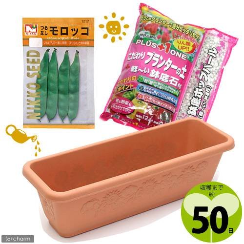 種を蒔いて50日後に収穫できます。短期間で手軽に収穫できる人気の野菜の種と、オシャレなレリーフプランター、培養土、鉢底石がセットになって登場です。鉢底石をプランターの底に敷き詰め、土を入れて種を蒔けば栽培スタート。とっても簡単です。プランターはスタンダードな65cmタイプなので、ベランダやお庭のちょっとしたスペースがあれば気軽に始められます。セットの培養土、鉢底石はプランターにちょうど良い容量なので、残った土の置き場所に困る心配もありません。収穫まで50日。「つるなしモロッコ菜豆」栽培セット (種・土・鉢底石・プランターの4点セット) セット内容 野菜の種 ~つるなしモロッコ菜豆~ × 1袋 シャンティー プランター 65型 サンドブラウン(サイズ(約):W65×D22.5×H18.3cm) × 1 プラスワン こだわりプランターの土(12L)+軽~い鉢底石付(2.8L) × 1 本セットの野菜について 【特長】 草丈が約45cmのつるなし種で、播種後約50日で収穫できる極早生種。濃緑色の莢はスジがなく、品質が特によくて、やわらかさと風味は抜群。取り遅れても味がほとんど落ちません。莢つきのよい豊産量で作りやすく、自家菜園に最適です。