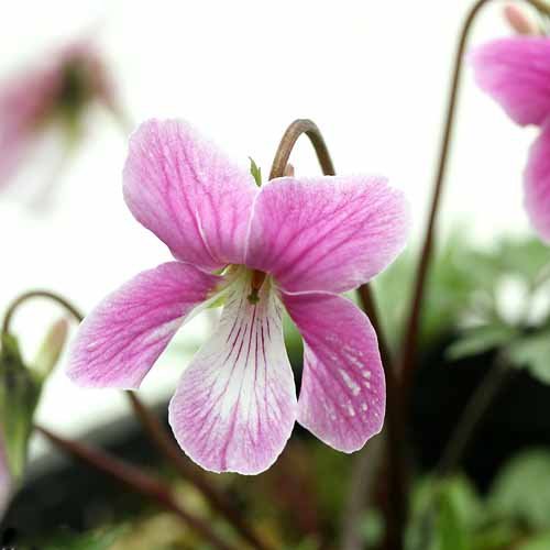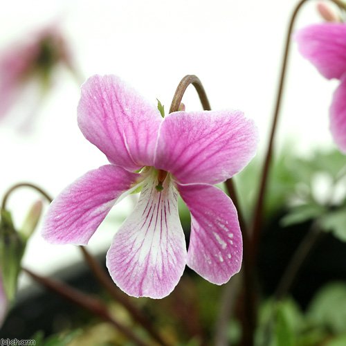 紅花ナンザンスミレ“紅鶴"は近年になって作出されたスミレの人工交配種です。エイザンスミレと紅花ナンザンスミレの交配により作出され、濃いピンクの花は中央が白く抜け、美しい色彩から人気の品種となりました。深く切れ込み入った葉はナンザンスミレの特徴が強く出ていることが多いです。