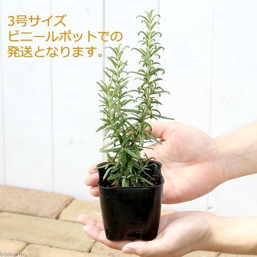 リフレッシュ効果が期待できるハーブの代表品種!地中海沿岸が原産のハーブを代表する品種です。松の葉に似たスッキリした香りは、若さを保つ香りとも言われハーブバスなど美容には最適です。花はブルーで可愛らしく、サラダの飾り付けにも利用できます。花壇、鉢植えで楽しめます。暑さや乾燥、病害虫にも強く丈夫に育ちます。葉や茎は肉料理の風味付けに使用します。茎を垂直に伸ばす立性と、横に這うように伸びる匍匐性、半立性があります。ローズマリー(立性) 3号(お買い得3ポットセット)セット内容ローズマリー(立性) 3号ポット苗