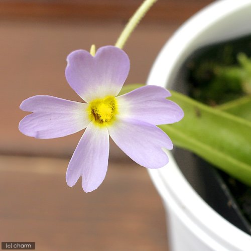 ムシトリスミレ属プリムリフローラです。ムシトリスミレは葉が粘着質の粘液で覆われており其処を通る昆虫を捕虫し養分とします。こちらは葉がねじれる種類のムシトリスミレで冬芽はつけません。また、比較的寒さに強く冬場は根が凍らないよう管理すれば良いでしょう。プリムリフローラは日当たりのよい場所を好むので、年間を通じて日当たりのよい場所で育てますが、真夏は暑過ぎるので午前中、日光に当てるぐらいにします。