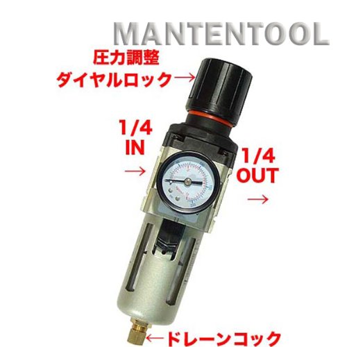 "工具の寿命を短くする原因であるコンプレッサー・配管からの水分や不純物を自動的に排出するレギュレーター付エアーフィルター フルオート2分(圧力調整減圧弁・空圧補器)です。 タンク内に一定量の水がたまるとコンプレッサー再起動時に自動的に排出します。 本体はスチール製なので耐久性にも優れております。 ~仕様~ ・圧力調整範囲:1~9.5kgf/c㎡ ・エアー接続口:1/4PT(2分) ・最高耐圧:10kgf/c㎡ ・タンク容量:水50cc(自動排出) ・本体サイズ:幅53×全長210mm ・本体:スチール製 ・重量:620g ・製造国:中国 ・PL保険加入商品 ※商品改良の為、仕様・外観は予告なく変更する場合があります。 ※輸入商品に付き、多少のキズや汚れなどがある場合がございます。 ~レギュレーター付エアーフィルター フルオート2分(圧力調整減圧弁・空圧補器)の用途~ エアーコンプレッサーとエアーツールの間に接続する事によって、水分や不純物を自動的に排出しエアーツールの錆を抑え工具の寿命を延ばすことができます。 また塗装(ペイント)などの水滴を防ぐ役割もあります。"