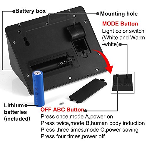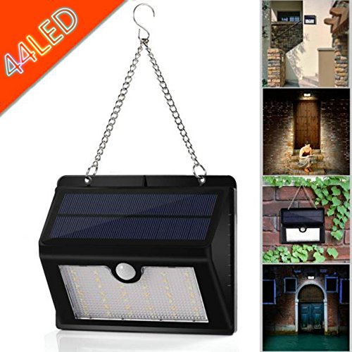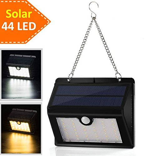 【選べる3モード】 1.常夜灯モード:夜暗くなると、自動点灯します(DIMモード)。44個のLEDライトで、高輝度な照明です。 2.人感センサー+DIMモード:人の動きを感知すると強く発光します。また、人がセンサーの範囲外に出ると10秒後にライトが薄暗く点灯します。 3.人感センサー+消灯モード:人の動きを感知すると強く発光します。また、人がセンサーの範囲外に出ると10秒後、ライトは消灯します 【優れた耐久性・IP65防水仕様】 防水等級はIP65と非常に高く、防塵機能も備えているので、設置場所を選びません。 充電バッテリーは過充電防止機能付きで、安心です。 【2種類の選べる照明色】 白と黄色2色を、モードボタンにより選択できます。 場所の雰囲気に合わせて変えられるので、素敵な演出が可能です。 【長持ち&簡単設置】 太陽光ソーラーパネルで、最速6時間でフル充電が可能です。 フル充電で、最長12時間の点灯。 配線不要で設置場所を選ばないのはもちろん、ネジで壁に固定することも、既存の金具にチェーンをひっかけて使用することも可能です。 誰でも簡単に設置できるので、玄関前や縁側、ガレージや庭先、私道はもちろんアウトドアにも大活躍してくれます。 【防犯・防災】 強い発光で、不審者に対して威嚇・防犯の効果があります。 また、一切の電源が不要のため、震災時や停電時に非常に役立ちます。一つは備えておくと安心です。 <使用方法> ソーラーライトの背後にOFFABCボタンとMODEボタン2つのスイッチがあります。 【OFFABCボタン】 【1】常夜灯モード:3秒間スイッチを押すと、ライトは二回点滅して常夜灯モードになります。 【2】人感センサー+DIMモード:ボタンを二回に押すと、ライトは3回に点滅して人感センサー+DIMモードになります。 【3】人感センサー+消灯モード:ボタンを三回に押すと、ライトは4回に点滅して、人感センサー+消灯モードになります。 【MODEボタン】 【1】ボタンを一回に押すと、照明色は黄色に。 【2】ボタンを二回に押すと、照明色は白色に。 <製品仕様> ・ソーラーパネル:5.0V 1.3W,17%転換率 ・LEDワット数:2.5W ・センサー角度&距離:120° 6メートル以内 ・センサー時間:10秒 ・充電時間:約6時間 ・照明時間:約12時間 <注意事項> 【1】最初の使用時は、フル充電してください。 【2】充電する時は、スイッチがオンの状態を確認してください。太陽光転換率は17%です、朝から夕方まで直射日光のあたる場所に設置してください。 【3】ON(オン)の状態でも、周囲が明るい場合は点灯しない場合がありますので、常時明るい場所に設置することは避けてください。 【4】時間帯により日光が当たらない場所では充電不足となり点灯時間が短くなったり、または点灯しないこともあります。