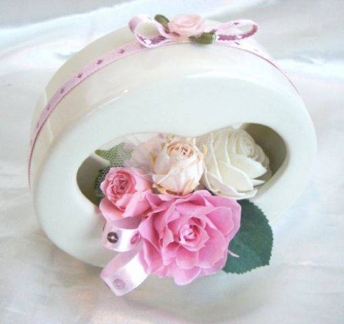 ギフト対応 ハート型にくりぬいた空間をお花でうめてアレンジしました。 フラワーベースサイズ :幅12×奥行9×高さ12cm 花器 :陶器ハート型 花材 :プリザーブドローズ フェイクリーフ・ソーラーフラワー チュール・リボン