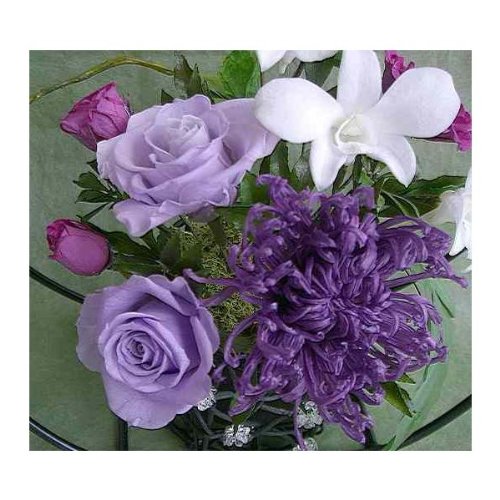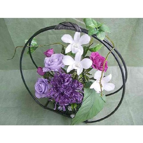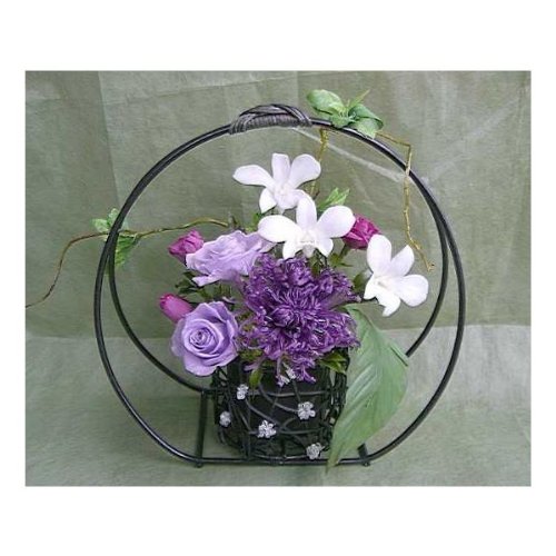 サザレの水晶を花器とアレンジの中に入れてみました、贈り先の方々の無病息災・家内安全を願って贈ってはいかがでしょうか!? 言わずと知れた、水晶にはお守り、浄化の作用があると言われています。 紫色のトーンを変えたすがすがしく気品のあるアレンジと水晶のパワーを加えたアレンジに仕上がりました。 年輩の方へのお礼、季節の御挨拶などに御利用下さい。 和の空間でも、洋風な空間でも違和感なく溶け込みます。