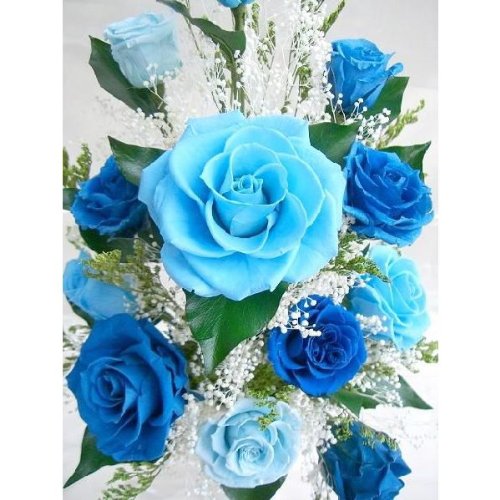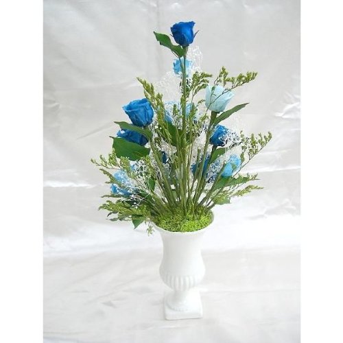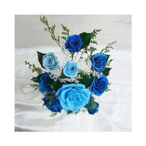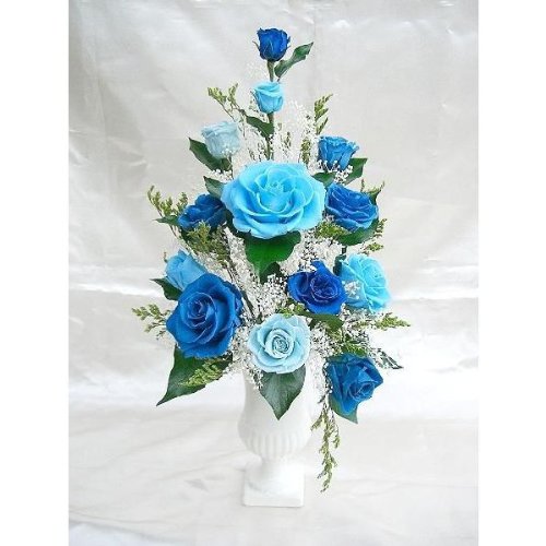 とっても涼しげなカラーです。 ブルーのバラは、本当に珍しい、プリザーブドならではのカラー。 インテリアの一部としてコーディネートしてみてくださいね。 落ち着いた空間を演出したい店舗などにもおすすめです。